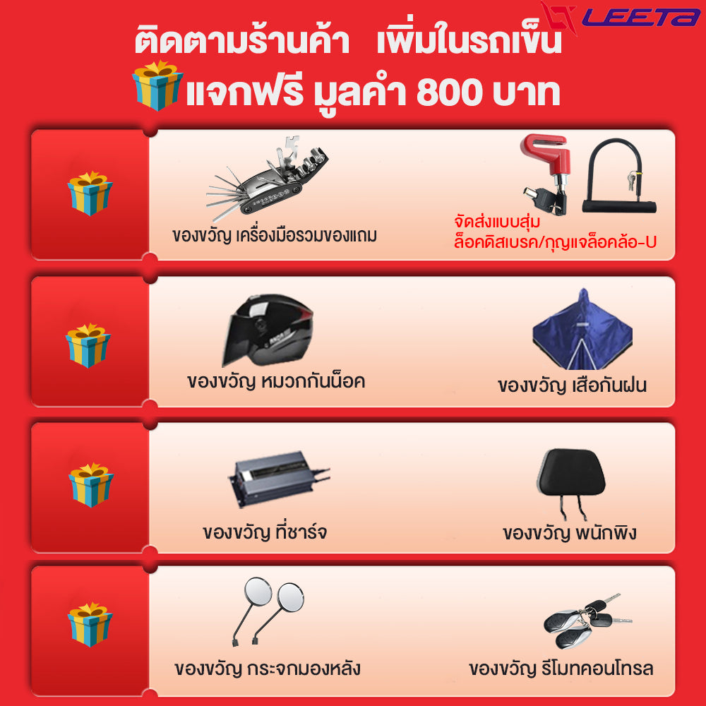 ล็อคดิสเบรค/กุญแจล็อคล้อ แบบตัวยู(จัดส่งแบบสุ่ม), หมวกกันน็อต , เสื้อกันฝน , ที่ชาร์จ , กระจกมองหลัง , แผ่นแป้นเหยียบ ,รีโมทคอนโทรล, พนักพิงหลัง,เครื่องมือรวมของแถม
