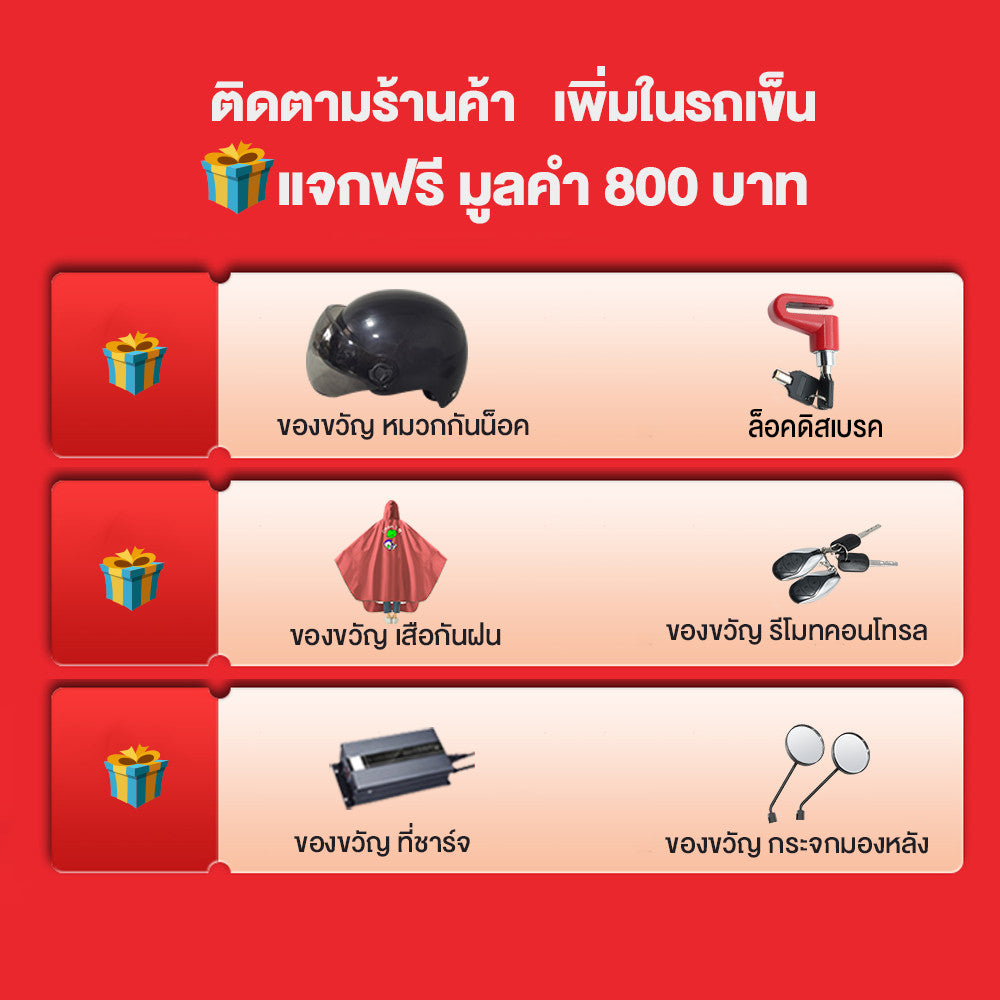 พร้อมอุปกรณ์เสริม 7ชิ้น (ของแถม) : กล่องท้ายรถ, ล็อคดิสเบรค, หมวกกันน็อต , เสื้อกันฝน , ที่ชาร์จ , กระจกมองหลัง ,รีโมทคอนโทรล